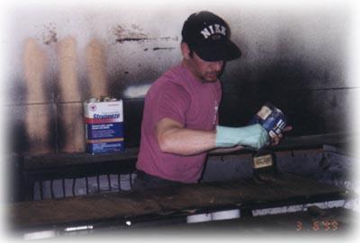 It is extremely important to make the distinction between hand stripping and dipping. Hand stripping, as the name suggests, is performed by hand. Several coats of professional strength stripper are applied to the piano's veneer with a brush and then removed with a hand-held scraper. Once the old lacquer has been removed, the wood is washed--again, by hand--with a professional strength thinner and steel wool. "Dipping" is a process in which the piano's various parts are literally--and repeatedly--dipped into a vat of stripper until the old lacquer falls off. The greatest risk involved in "dipping" is the stripper's potential to penetrate and ultimately damage the wood itself. Although it is certainly more time-consuming, hand stripping is by far the best method if one is to preserve the original state of the wood. Hand Sanding and Staining Once the stripping has been completed, the piano is then sanded by hand with 120-grit sandpaper. The type of finish, i.e., either ebony or natural determines the shade to which the veneer is sanded. A piano receiving a natural finish is always sanded to an even and uniform color. The next step is the application of a high quality, paste wood filler. The purpose of this procedure is twofold: first, in the case of natural finishes, the filler adds color to the veneer-- those customers receiving a natural finish are requested to approve a color sample before any further work is performed; second, the paste actually fills in the pores of the piano's wood. Sealing and Priming At this point, five coats of sealer (or in the case of ebonies, black primer) are applied with a spray gun. This is then left to dry for four to five days. Application of Lacquer Once the primer has been given sufficient time to dry, it is scuffed down with 180-grit sandpaper and six coats of high gloss black lacquer are applied. After another four to five days, the piano is scuffed--once again with 180-grit sandpaper--and the final six coats of lacquer are applied. The finish is then given approximately ten days to cure before the final stage, hand rubbing. Hand Rubbing Hand rubbing (wet sanding), is the final stage of the piano's cosmetic journey. This is the most critical period of the refinishing job, because any mistakes--for example, sanding through the lacquer to primer, or worse, bare wood--could take several days or weeks to remedy.In a mechanical sense, rubbing is very similar to that of standard sanding or scuffing. Like scuffing, the objective is to remove all pores from the piano's surface. The primary difference however, is that rubbing requires the use of a much higher grade of sandpaper, typically 400-grit, as well as water and a professional wool-wax to act as lubricants. Once the sanding has been completed, each piece is rubbed out with wet steel wool to give the finish a deep, satin sheen. |